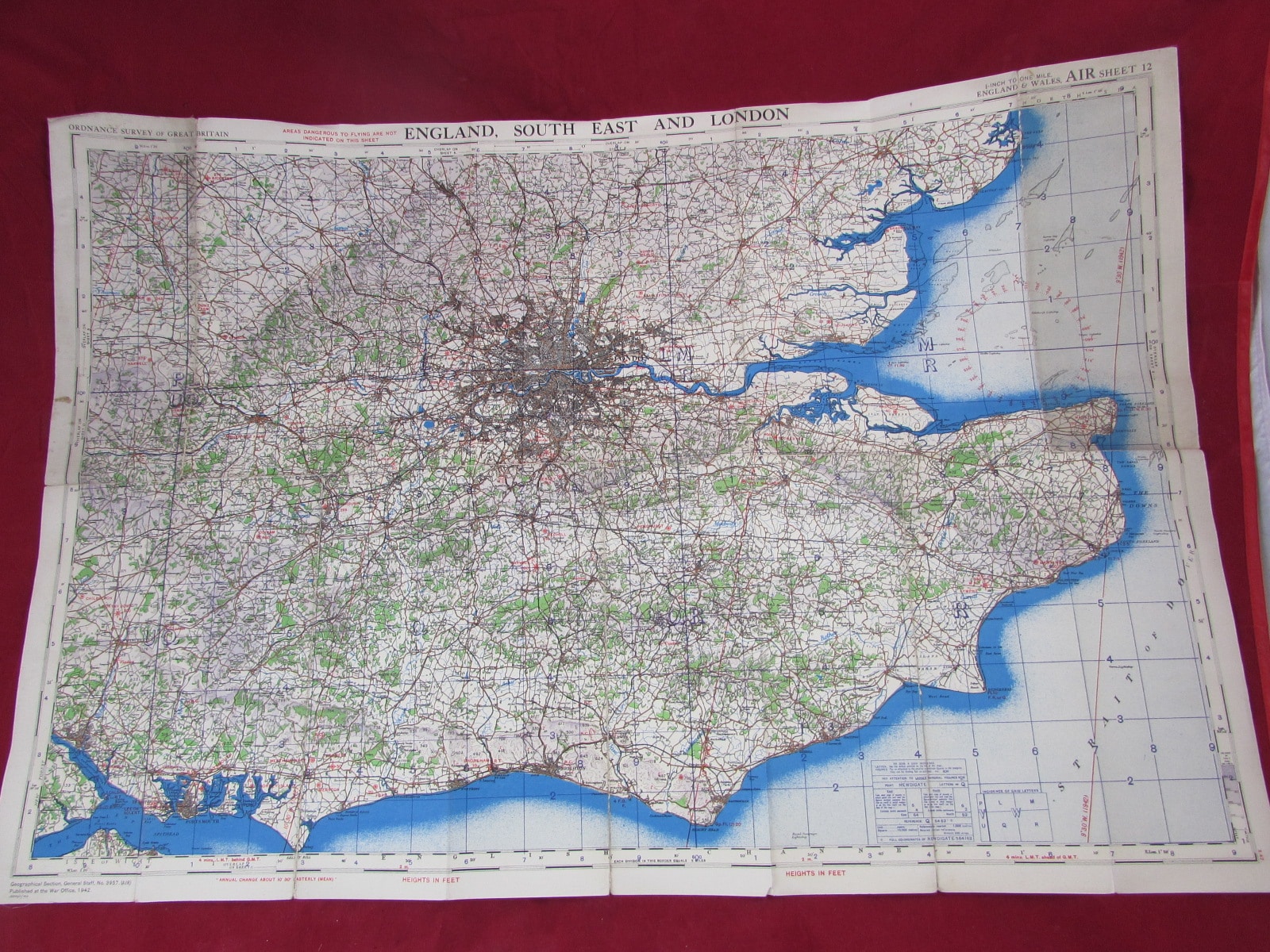 1942 Linen-Backed Air Map – England, South East & London (WW2 Period RAF / Aviation Map)